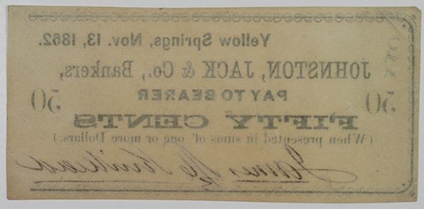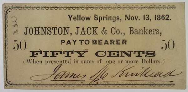 Yellow Springs, PA. Johnston, Jack & Co. Bankers, 50¢, Nov. 13, 1862, H-467-03, Issued Obsolete Scrip Note. Rare in this form, AU to Uncirculated condition. Rare.
