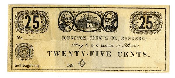 Hollidaysburg, Pennsylvania, 25 cents, Remainder, H 159-45, VF, design of Washington and notable flanking building in middle, Rare note in any condition. The last 2 notes that appeared in auction were of a different design and were remainders, this examples is much scarcer