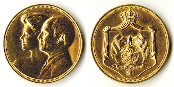 Medallic Royal Hashemite Court Issue, ND (ca. 1988), Gold, featuring profile of King Hussein and Queen Noor, special presentation medal struck the Royal Court to be given to special dignitaries and other VIPs. An example at the Museum of the Central Bank of Jordan, ad it is estimated that a maximum of 50 pieces were struck, this one being one of two known in private hands. Exceptionally rare. Choice Uncirculated.