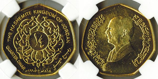 Pattern 1/4 Dinar, AH1415//1995, nickel-brass, KM# Pn17, like KM# 61 which was issued in 1996, but with an earlier date, NGC graded SP 62 (1561062-001). Ex-Bseiso Collection. First time for this type to be offered in a public auction.