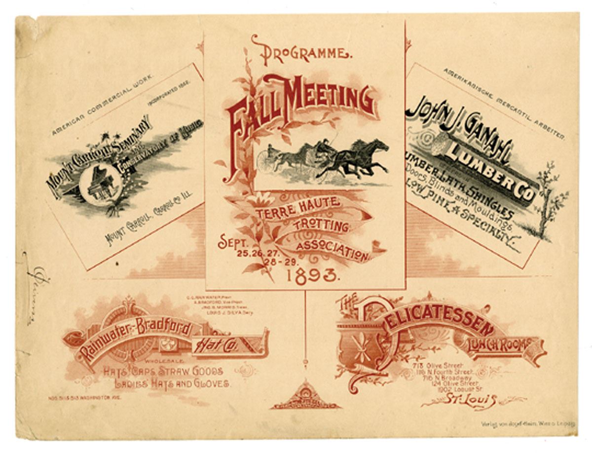 Germany, ND (1870s-1880s). Amerikanische Mercantil Arbeiten (American Mercantile Work), Companies include Terre Haute Trotting Association; Delicatessen Lunch Room, St. Louis; Mount Carrol Seminary and Conservatory of Music and pothers, Broad sheet of Sample printing work, Brown and black printing, Approximately 16 inches x 12 inches, VF-XF condition.