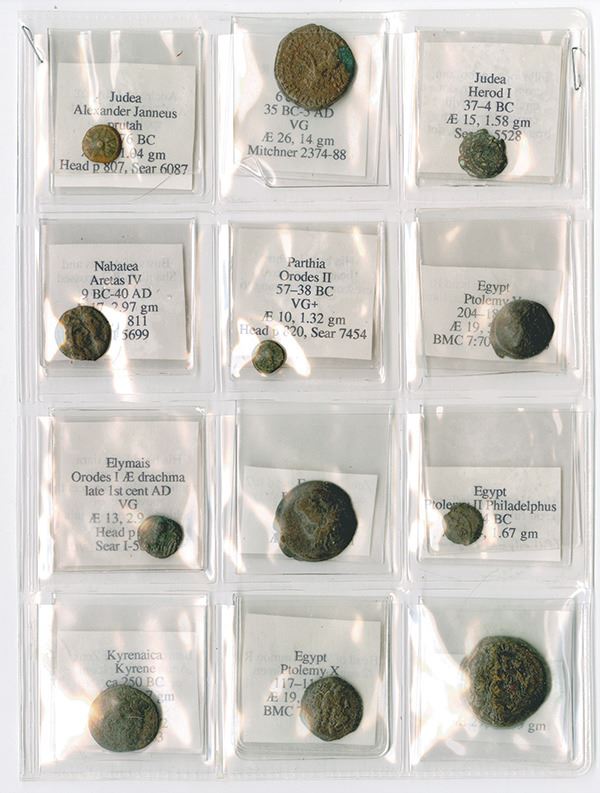 Lot includes 12 copper coins, all described/identified, from Nabatea; Parthia; Bakhria; Parthia; 2 from Judea (Alexander Janneus & Herod I); 5 from Egypt (Ptolemy II, Ptolemy VI, Ptolemy X); and others. Mostly Very Good condition. Please inspect, sold as is & no returns for any reason.