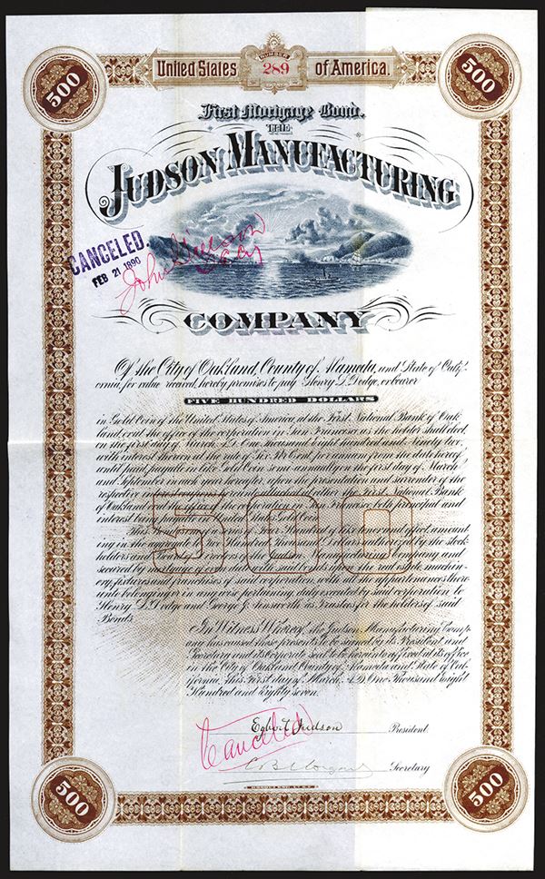 Oakland, California, $500, I/U, No coupons attached, S/N 289, XF, Judson Manufacturing Company was founded in 1882 and the operations comprised of a complete bridge and structural steel shops, machine shop, foundry and pattern shop and bolt and nut shops. JUDSON, EGBERT PUTNAM (Aug. 9,1812 - Jan. 9, 1893), inventor and manufacturer of explosives. In August 1867 three pounds of dynamite were made at this plant and used in a trial blast of boulders. This is considered to be the first instance of the manufacture and use of dynamite in the United States after the invention of that explosive by Alfred Nobel in 1866.