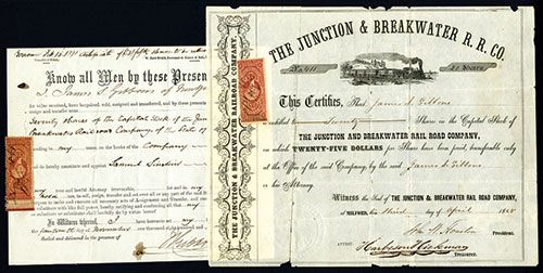 Delaware, 1868, I/U, 20 Shares, #411, Black print with simple black border and vignette top center of moving locomotive l-r with house on hill in the distance, VF condition, Red 25cent Washington revenue stamp on left.