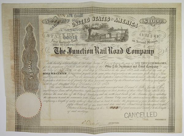 Ohio. $1000 7% 1st Mortgage on 2nd Division Bond, Black print on black border, Locomotive at top coming out from under a bridge, Stamped out cancelled at bottom, Fine-VF condition, Snyder & Black.