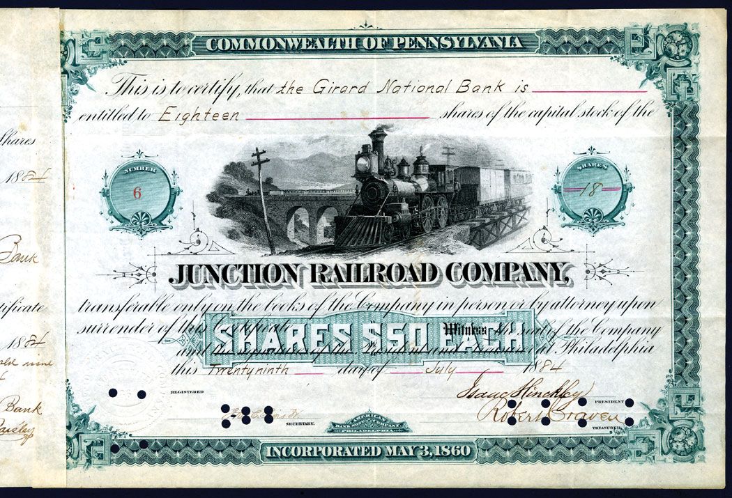 Pennsylvania, 1884, Junction Railroad Co. 18 Shares, $50 each, Stock Certificate, VF Condition. ABNC.