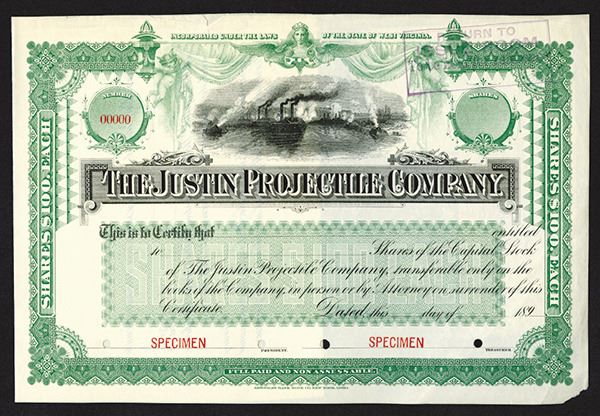 West Virginia. Odd Shares Capital Stock Specimen Certificate. Black on green border and underprint with Civil War Battle scene of iron clad ships and mortars during bombardment, Justin developed a dynamite shell that evidently did not work very well during the initial experiments and destroyed the guns that fired the shells, the shells were 3 feet long and 9 inches in diameter and held 30 pounds of nitro-gelatin, Rare early military weapon manufacturer. VF with lower right corner tip missing. ABNC.