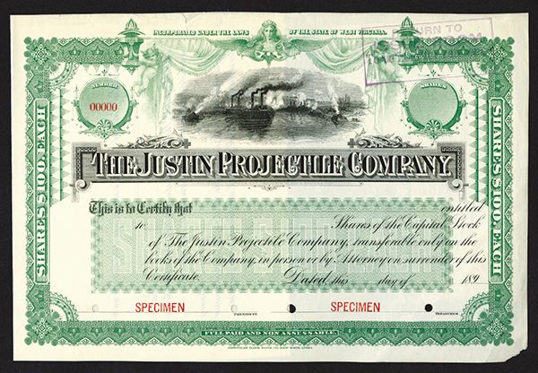 Jersey City, New Jersey, 189x (Ca.1892), Odd Shares, Specimen, Black on green border and underprint with Civil War Battle scene of iron clad ships and mortars during bombardment, Justin developed a dynamite shell that evidently did not work very well during the initial experiments and destroyed the guns that fired the shells, the shells were 3 feet long and 9 inches in diameter and held 30 pounds of nitro-gelatin, Rare early military weapon manufacturer. Vf with lower right corner tip missing. ABNC.