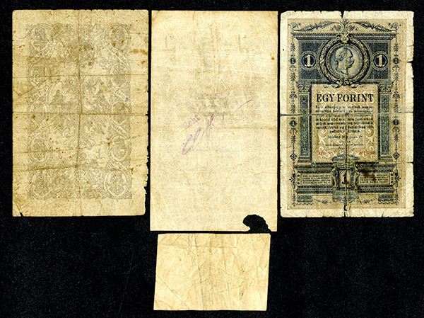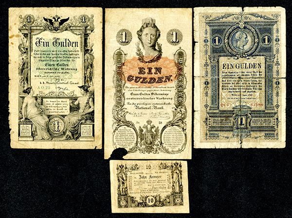 Austria. 1 Gulden, 1858 P-A84. Fine, paper Loss at bottom left, hand stamp on back; 10 Kreuzer. 1860. P-A93; 1 Gulden 1866. A150; 1882. A153; Mostly Very Good to Fine. 4 pieces.
