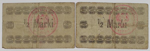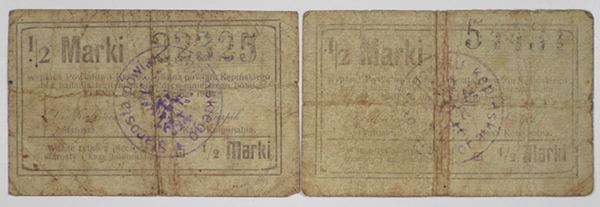 Poland. (Kepno, Posen), 1920. K-3709 Vii, Lot includes a pair of 1/2 Marki Notgeld, validation handstamp on back. K_pno is also known as Kempen in Posen. VG to Fine. (2)