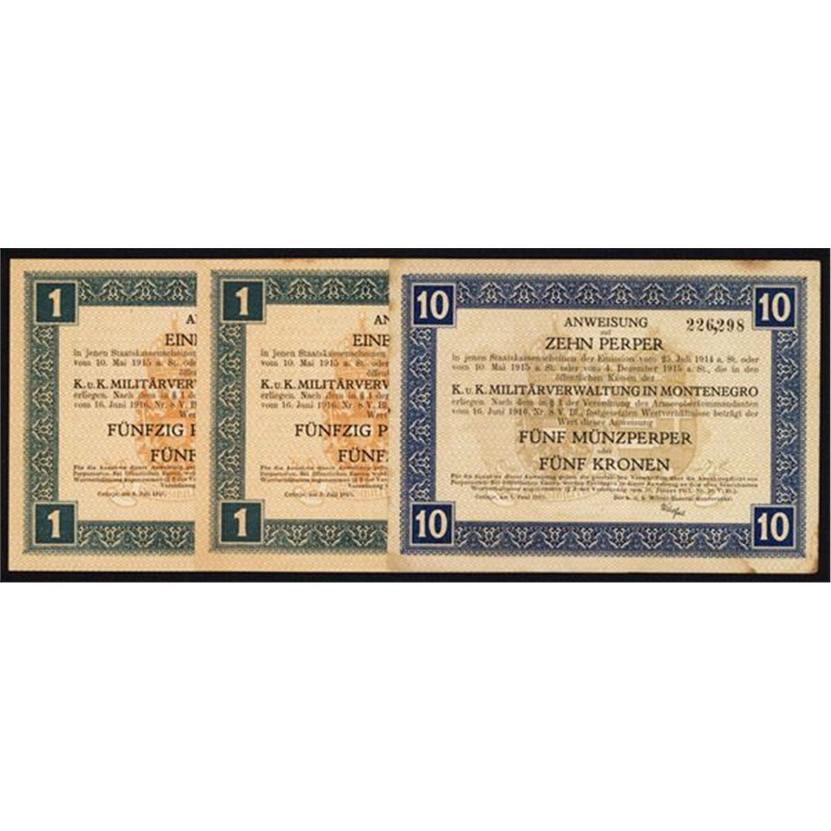 Montenegro, 1917, Lot of 3 notes, Includes 2 examples of 1 Perper-50 Heller, M148, both Uncirculated to CU Condition; 10 Perper-5 Kronen, M151, AU to Uncirculated Condition. Scarce WW I Military notes.