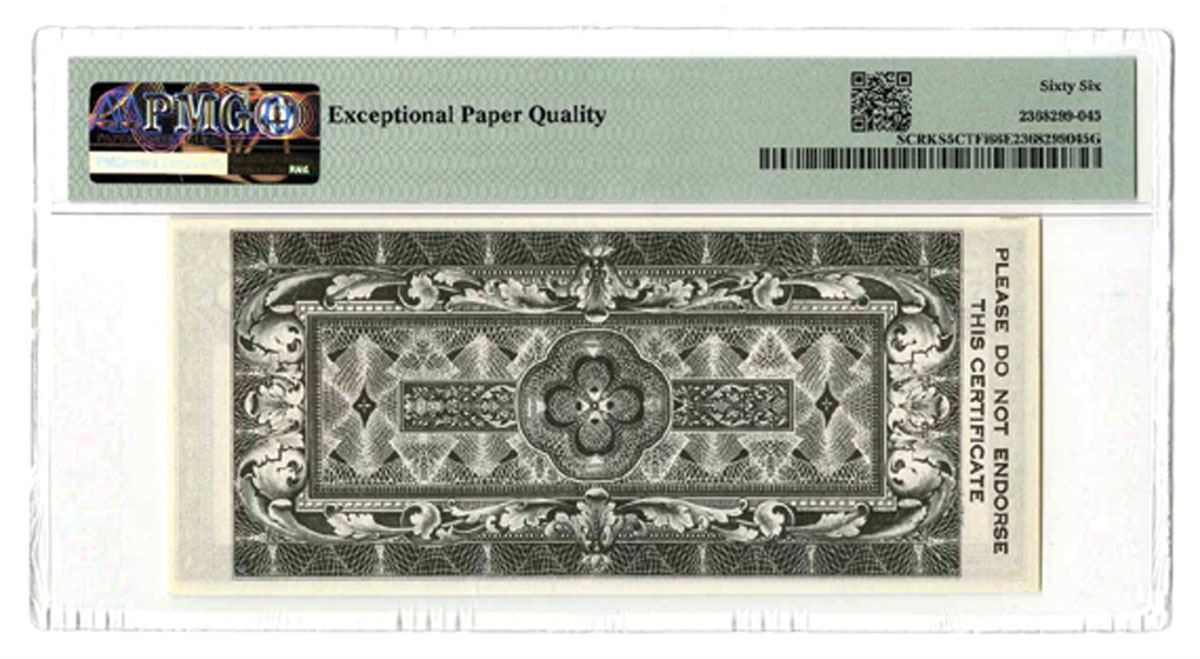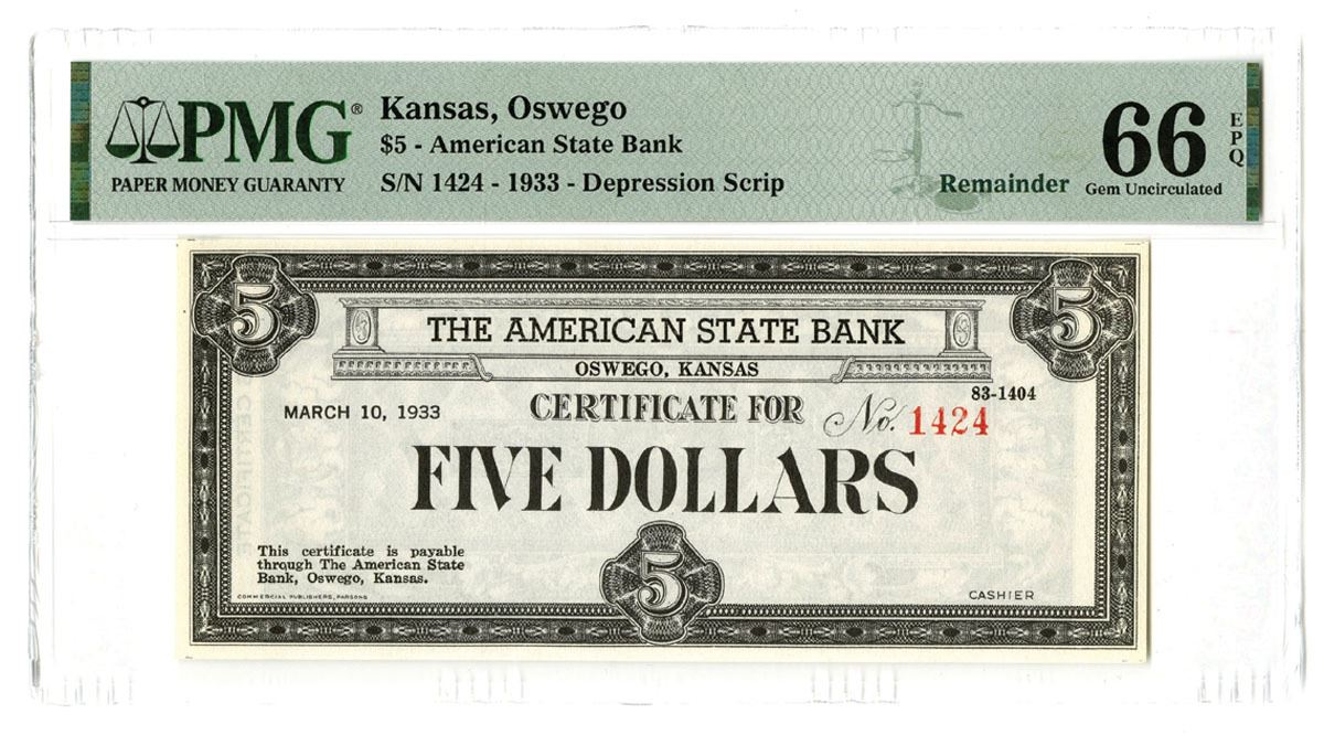 Oswego, Kansas, March 10, 1933. $5 Remainder Depression Scrip Note, Black print with red serial numbers, Back is black with design at center, S/N 1424, PMG graded Gem Uncirculated 66 EPQ.