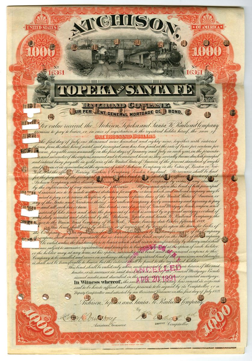 Kansas, 1889. $1000 I/C 4% General Mortgage Gold Coupon Bond, Black text with orange border and under print, Men in rail station at top center, Stamp crenelled at bottom and multiple POCs and Cut Outs, VF to XF condition, ABNC.
