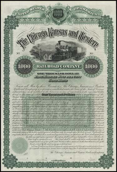 1886. Specimen bond. $1000. 1st mortgage 5% Gold Bond. Green border and undertint. Locomotive R to L with small train in background going over bridge. POC's. Coupons attached. From the files