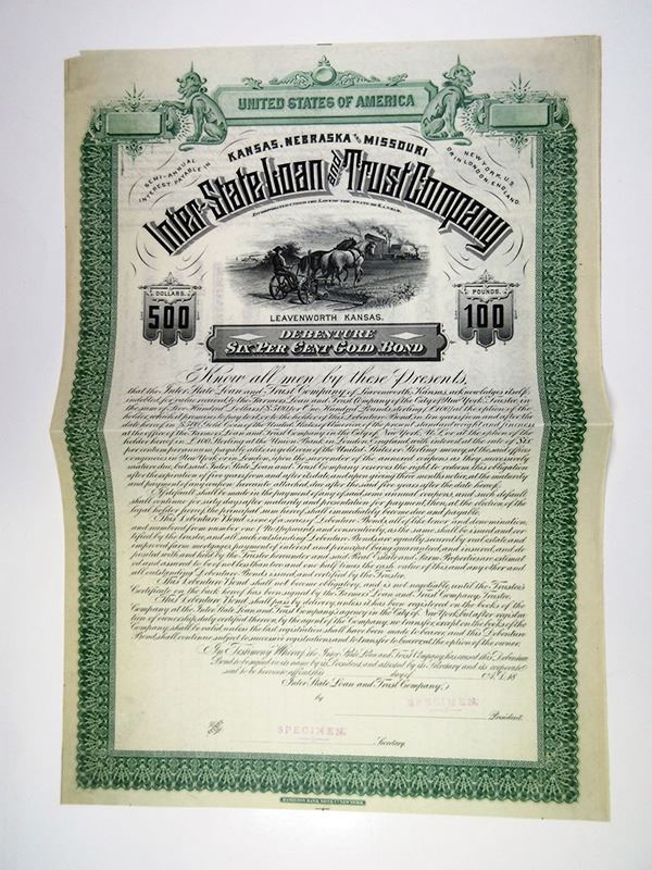 KS. Inter-State Loan & Trust Co., 1880s $500 Specimen 6% Gold Coupon Bond, XF, Leavenworth, Kansas. Inter-State Loan & Trust Company, $500 6% Debenture Bond, Black on green border and underprint, Man plowing in middle, VF, HBNC.