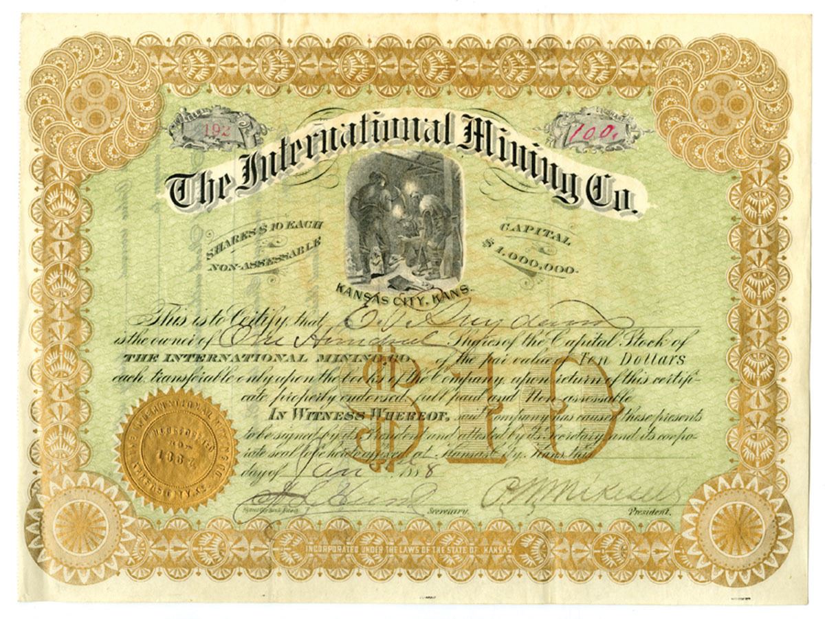 Kansas City, Kansas, 1888. 700 Shares Capital Stock I/U Certificate, Black print with gold border and green underprint, Mining vignette at center under title, S/N 192, VF to XF condition.