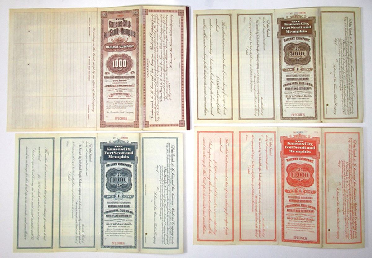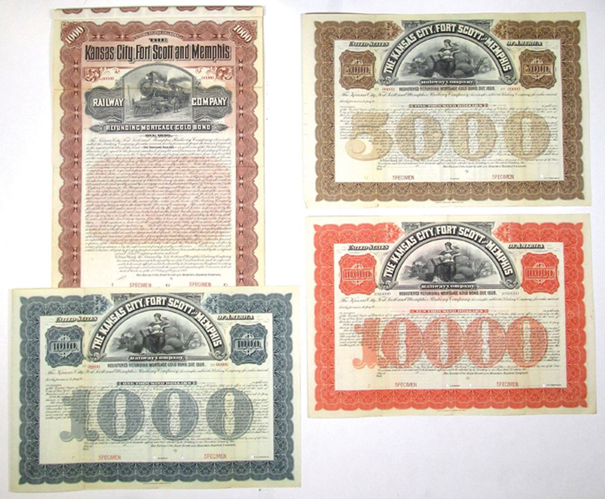 Kansas, 1904 to 1904. Lot of 4 Specimen Bonds, Includes: 1901, $1000 4% Refunding Mortgage Gold Coupon Bond with brown border; 1904, $1000 4% Registered Refunding Mortgage Gold Bond with blue border; $5000 4% Registered Refunding Mortgage Gold Bond with brown border; $10,000 4% Registered Refunding Mortgage Gold Bond with orange border. All have Specimen overprints, POCs, and are in Fine to VF condition, some with archival reinforcements, ABNC. (4). All of the Registered bonds are only known as Specimens, no issued examples known.