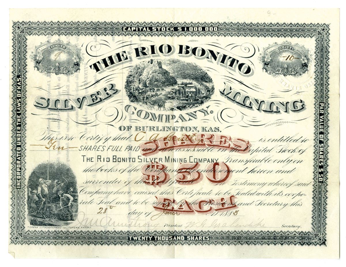 Kansas..., 1883. 10 Shares Capital Stock I/U Certificate, Black print on black border with brown underprint, Vignette at center under title and at bottom left corner, S/N 9, VF to XF condition. Possibly a Colorado mine. Needs further research.
