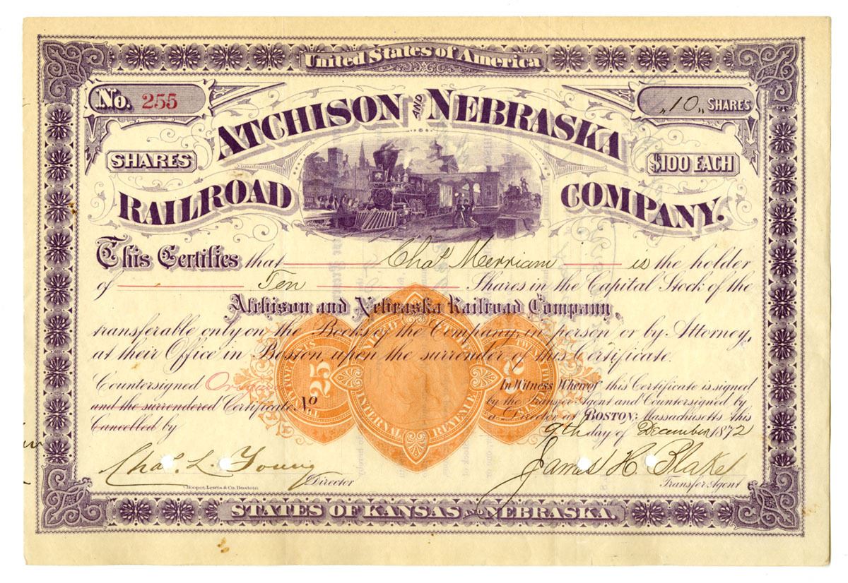 Kansas and Nebraska, 1872. 10 Shares Capital Stock I/C Certificate, Purple print with purple border and 25 cent orange revenue imprint center, Railroad stopped at station at top, S/N 255, POCs along bottom, VF to XF condition, Hooper, Lewis & Co.