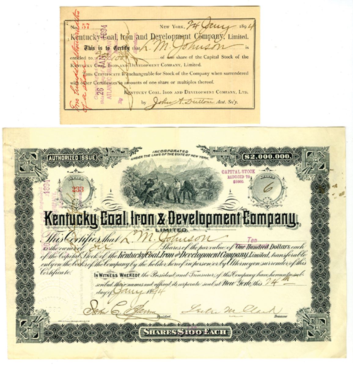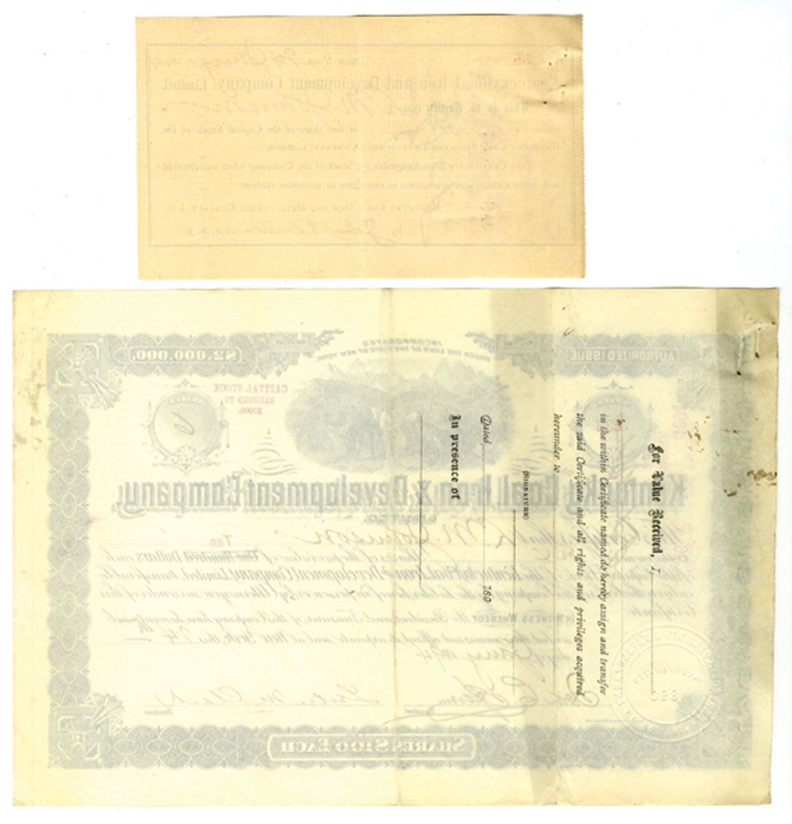 Kentucky, 1894. 6 Shares I/U Capital Stock Certificate, Black with black border, Vignette of miners at top center, S/N 233, Lot also includes Assignment slip from the Anglo-American Loan and Development Company, Ltd. of New York, indicating transfer of shares. Fine to VF+ condition with stains and staple holes. Globe Stationary & Printing Co.