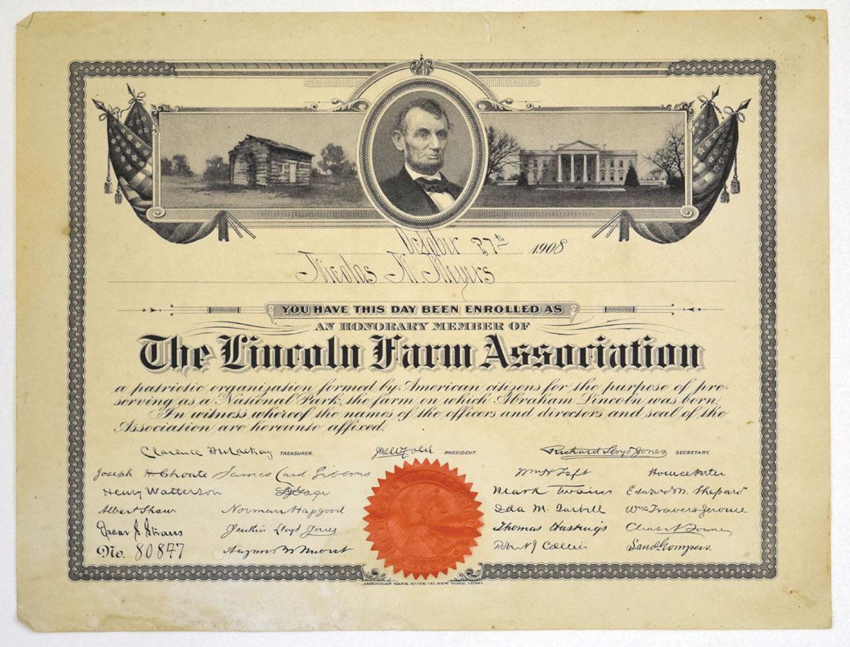 Kentucky, 1908. Issued Honorary Member Certificate for the Lincoln Form Association, Black print with portrait of Lincoln at top with log cabin to left and White House at right, Red embossed seal at bottom center. VF to VF+ condition with toning, stains, and small tears around margin. Issued during the early 20th-century historic preservation movement, this certificate relates to the Lincoln Farm Association, organized in 1906 to acquire and preserve Abraham Lincoln’s birthplace in Hodgenville, Kentucky. The Association’s efforts directly led to the creation of what is now Abraham Lincoln Birthplace National Historical Park, making these honorary membership certificates tangible artifacts from one of the earliest nationally coordinated preservation campaigns dedicated to an American president.