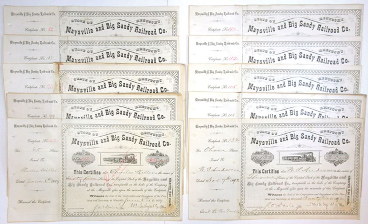 Maysville, Kentucky. 1888-1902, Lot of 10 I/C Capital Stock Certificates for various amounts of shares, Certificates numbers range from #82-#150, All are printed in black with black border on small sized certificate, company title at top, small illustration of locomotive below, POC's along bottom, Fine-VF condition, some with minor condition issues due to handling. Excelsior Printing Works. (10)