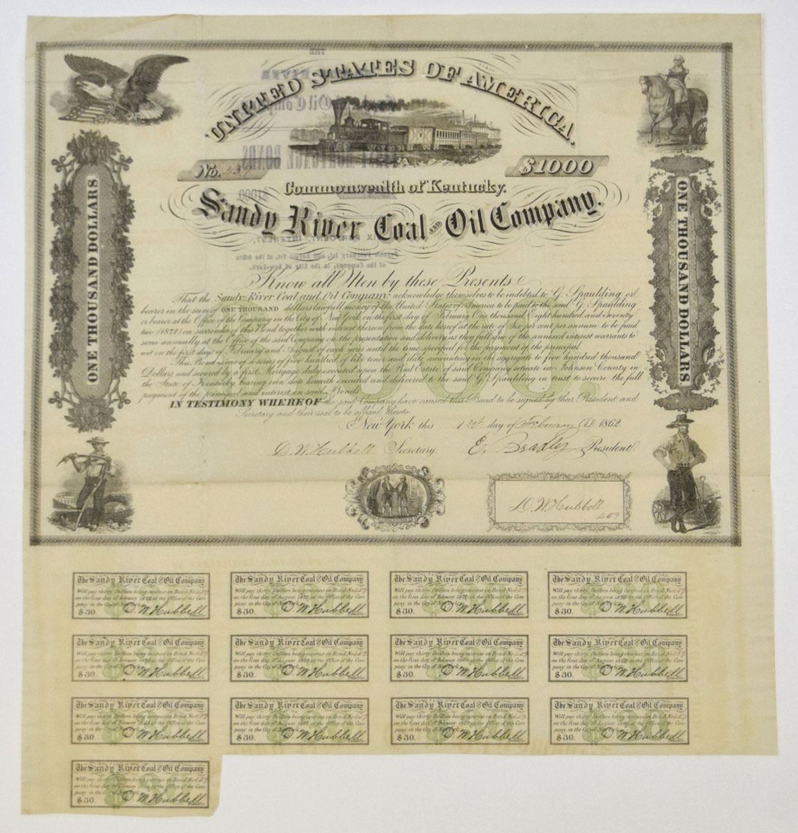 Kentucky, 1862. $1000 I/U 6% Coupon Bond, Black print with black border and green underprint, Locomotive at center under title at top and other vignettes at each corner, S/N 459, VF to XF condition.