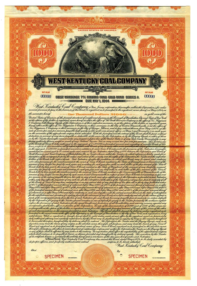 New Jersey. $1000 Specimen 7% Series A, 1st Mortgage Sinking Fund Gold Coupon Bond, Black print on large orange border and under tint, Image of two allegorical figures examining a bucket of coal at top, Specimen overprints, POC's, VF-XF condition. ABNC.