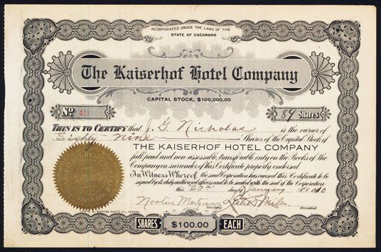 Colorado, 1910, 89 Shares, Issued and Uncancelled Stock, #40, Black print with black ornate border and gold seal bottom left, VF-XF condition, W.H. Kistler Stationary Co.