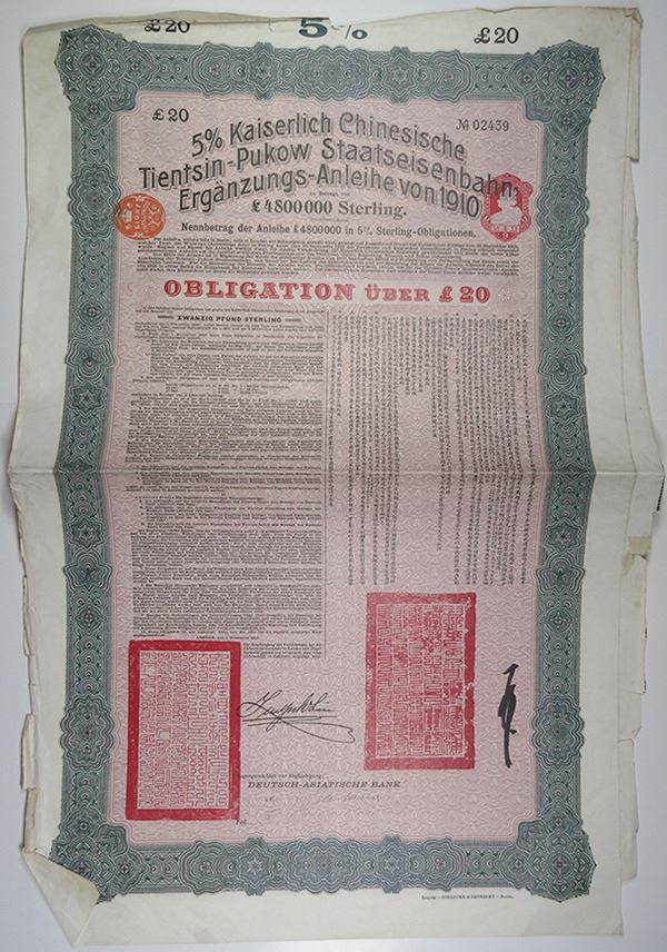Imperial China, 1908. £20, I/U 5% Sterling Coupon Bond, Large format, Black text in both German and Chinese with green and lilac border with lilac background. Fine condition with compromised margins and staining. Printed by Giesecke & Devrient.