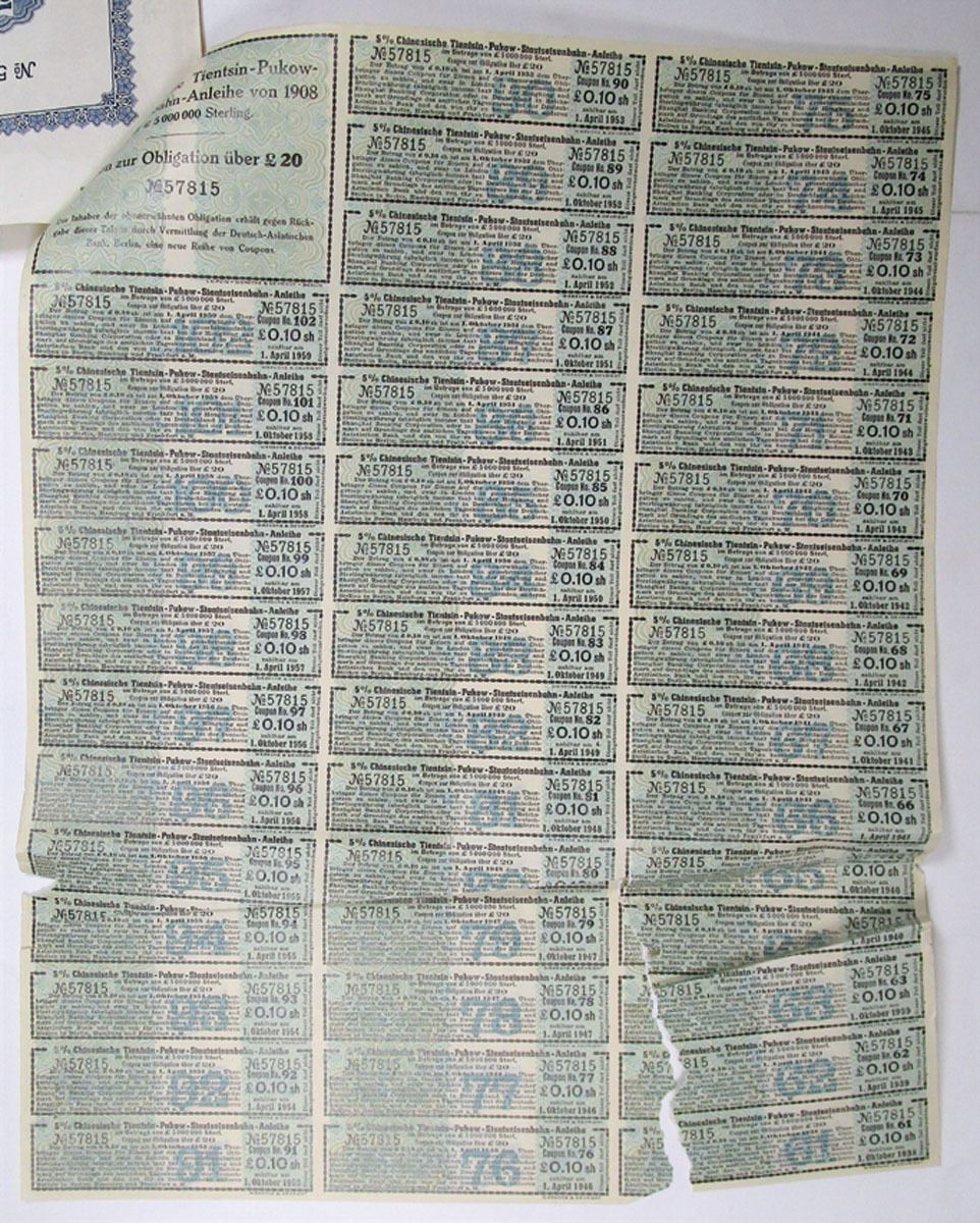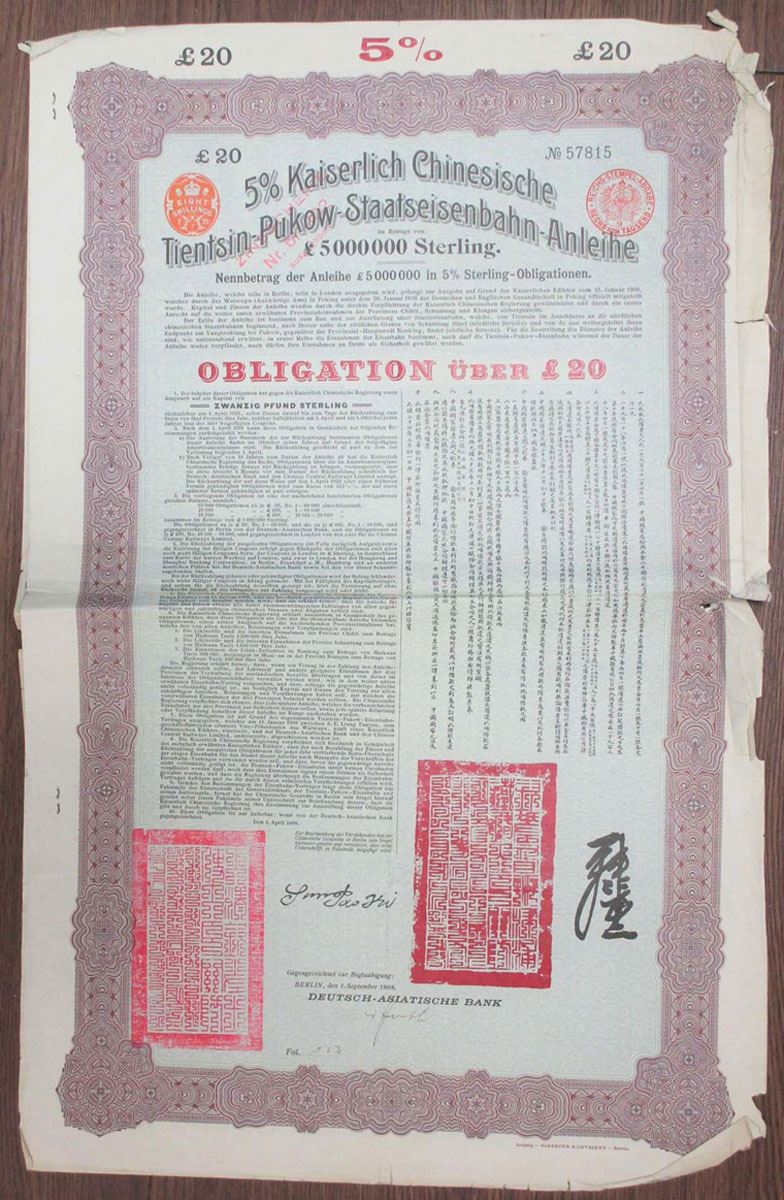 China, 1908. £20, I/U 5% Coupon Bond in Chinese and German, Black text with purple border and light blue background. Fine condition with damage to margins.