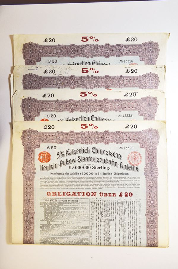 China. Lot of 4 bonds, all are 20 Pounds Coupon Bond, Black print on lilac/brown border and light blue underprint printed on large sized certificate in Chinese and German, Company title at top, Fine-VF condition. G&D. Very Fine. 4 pieces.