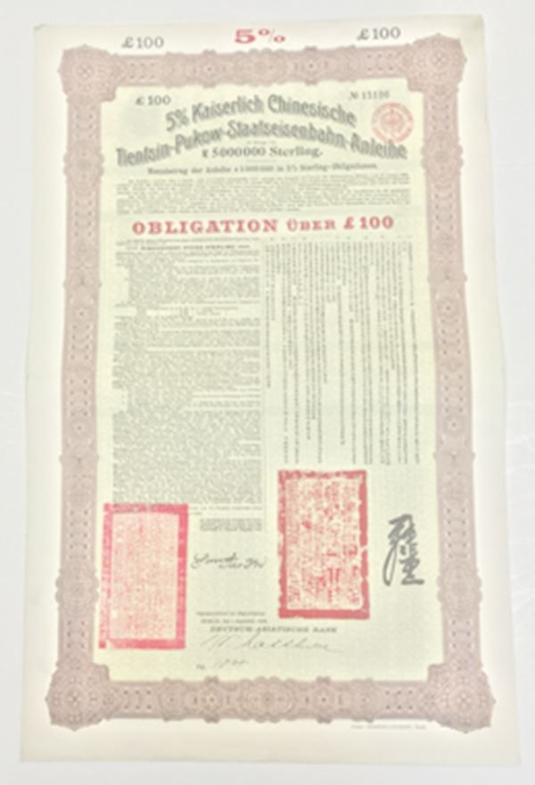 China. £100 Issued 5% Coupon Bond, Black print on purple border and green under tint, Large format. VF-XF condition.