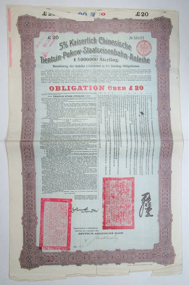 China, 1908. £20 I/U 5% Coupon Bond, Black print on blue/purple border and blue under tint, Company title at top, Printed in German and Chinese, Large format, Coupons attached. Fine-VF condition with some damage to margins. Giesecke & Devrient.