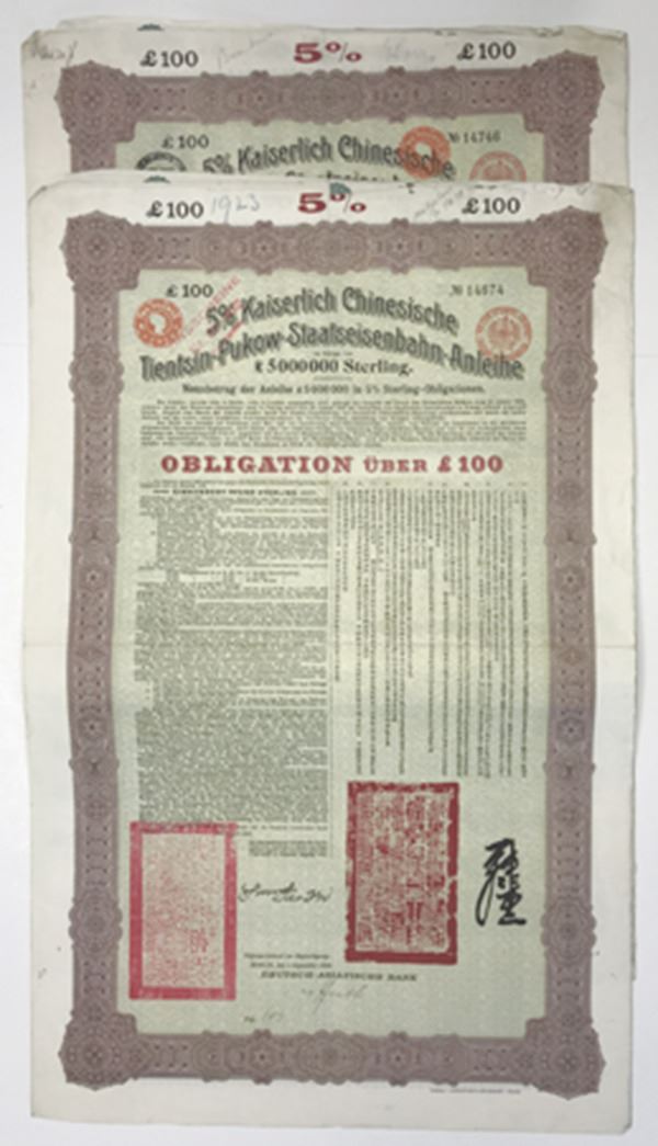 China. Lot of 2 bonds, £100 Issued 5% Coupon Bond, Black print on purple border and green under tint, Large format. Very Fine, some edge roughness.