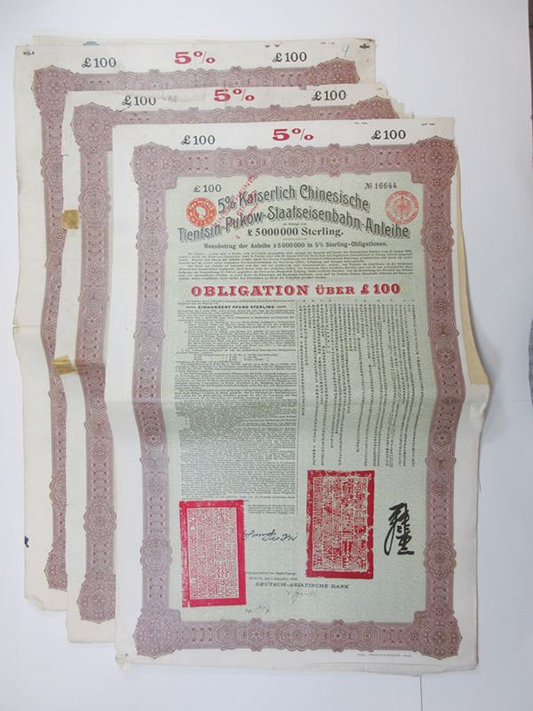 Kaiserlich Chinesische Tientsin-Pukow-Staatseisenbahn-Anleihe, 1908 Lot of 3 Issued Bonds