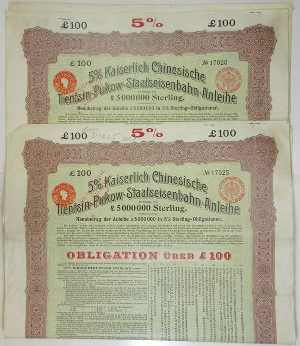China. Lot of 2 bonds, £100 Issued 5% Coupon Bond, Black print on green and pink border with pink under tint printed on Large format, Company title at top, Bond is printed in German and Chinese, Very Fine, some edge roughness, Giesecke & Devrient. (2)