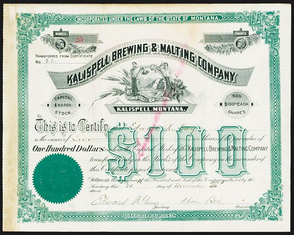 Kalispell, Montana, 1905, 2 Shares, Cert.#25, I/U stock certificate, Green border with Men flanking Mountain Waterfall Montana Arms, Green Company seal, Fine condition with light red ink stain possibly from soaking and glue stains on the left border. Scarce Montana brewery.