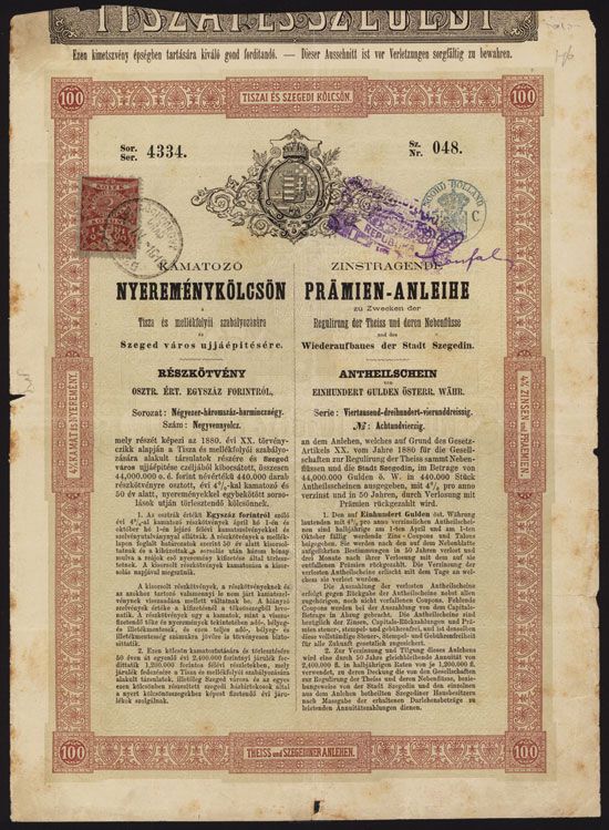 Budapest, Hungary, 1880, 4% Issued and Uncancelled Bond, Rectangular purple Ceskoslovenski Republika Stamp on top right, Country seal top center, Minor creases and tears along with some discoloration around the edges, Fine condition.