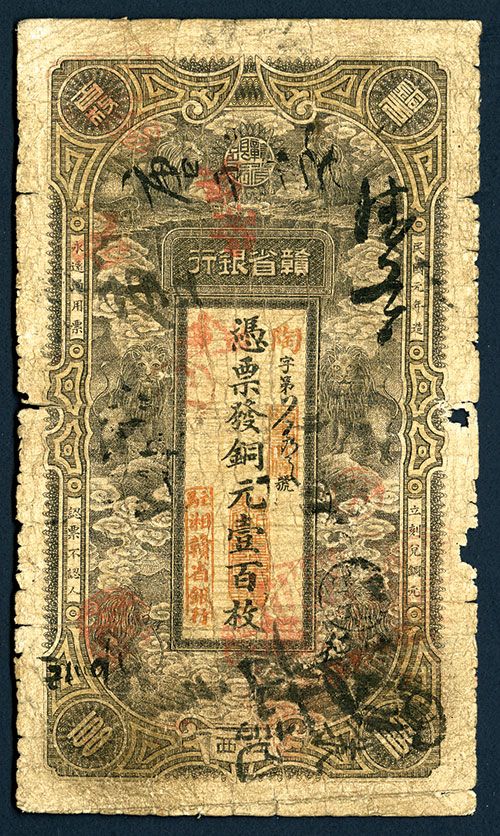 100 Copper Cents, P-S2223 (S/M#K2-0.3), Issued banknote, Black and yellow, Facing Dragons at top, Vertical format, back with shoreline at center, Choice Good to VG condition with edge faults, small margin tears and splits and graffiti, rare note in any condition.