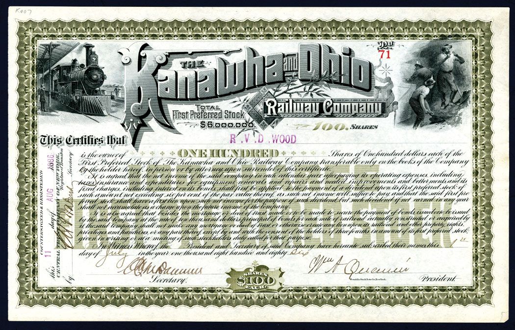 Ohio, 1886, Kanawha & Ohio Railway Co. 100 Shares, $100 each, Stock Certificate, VF Condition.
