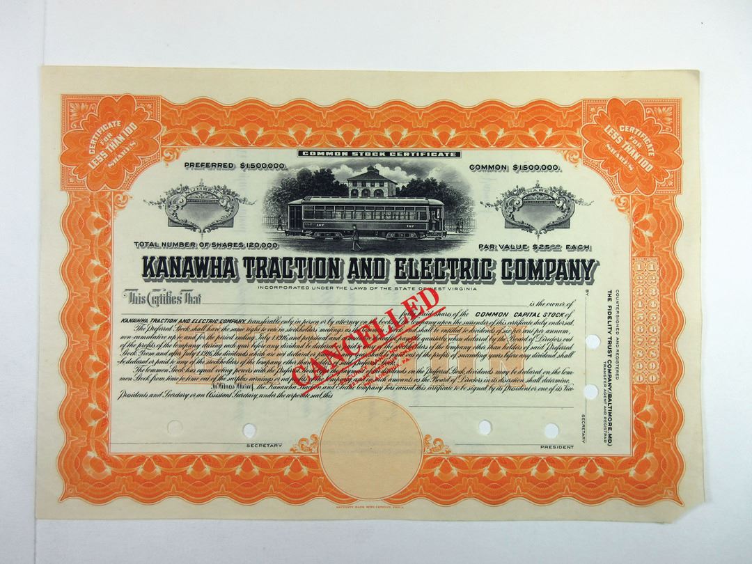 West Virginia, ND (1900-16). <100 Shares Common Capital Stock Specimen Certificate, Black on orange border and underprint, Electric street car at top in profile, Cancelled overprint and POCs, AU condition with missing bottom right corner. SBNC. Not listed as a specimen in Cox.