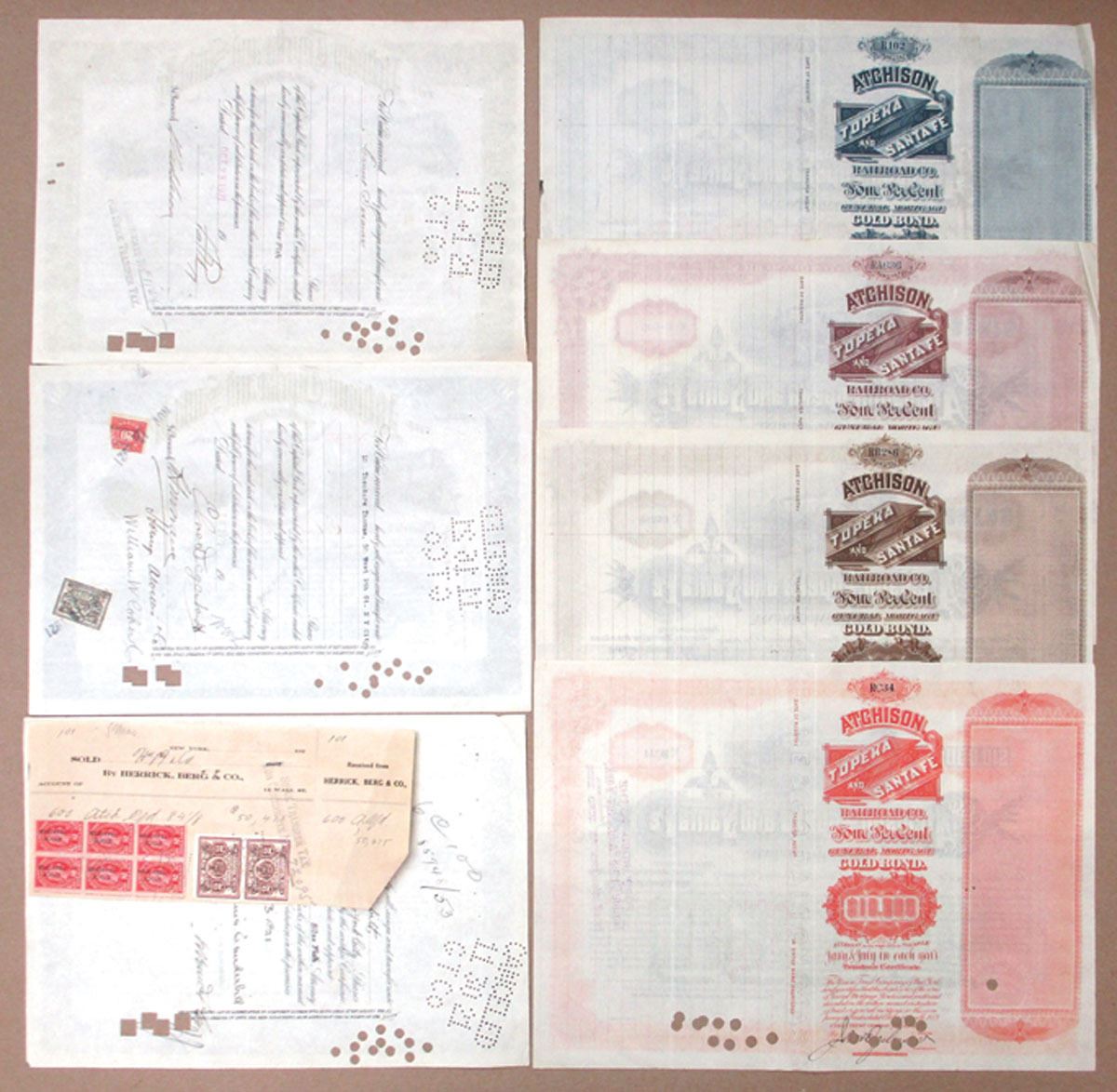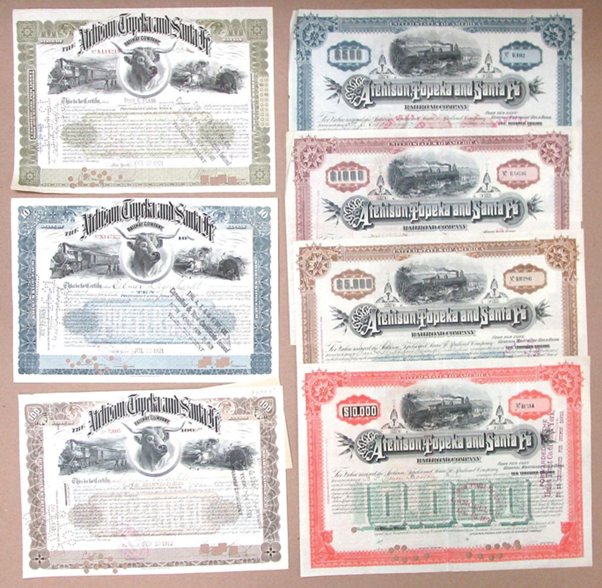 Kansas...., 1889-1921. Lot of 7 I/C Stocks and Bonds for various denominations/share amounts and in various colors, All are POC and are in VF to VF+ condition. The Atchison, Topeka and Santa Fe Railway Company (ATSF), founded in 1859, was a key player in connecting the Midwest to the western United States, driving settlement and economic growth. Renowned for its luxury passenger trains like the Super Chief and innovations in freight transport, it became a cornerstone of American rail history. In 1995, it merged with the Burlington Northern Railroad to form BNSF Railway, leaving a lasting legacy in transportation and the development of the American West. (7). Sold "AS IS" no returns accepted.