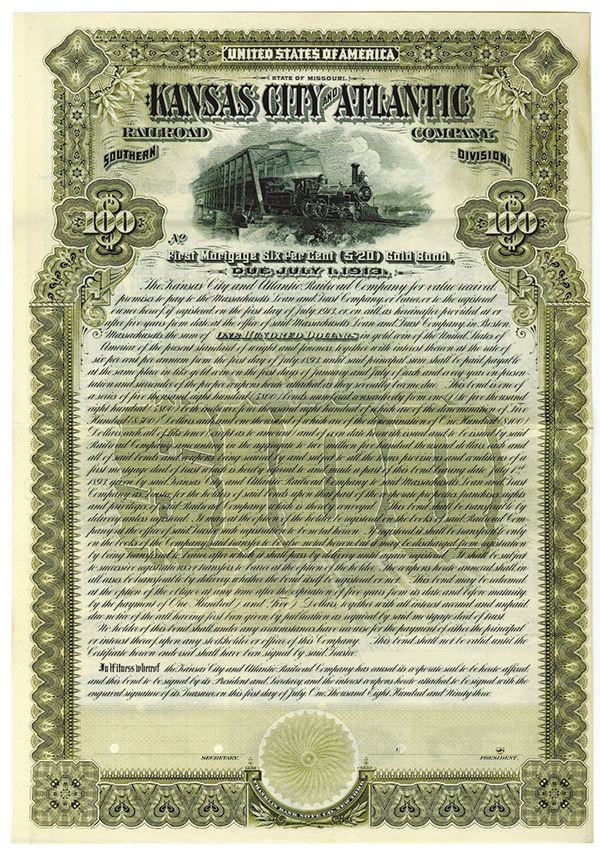 Kansas City, Missouri, Specimen 1893. Southern Division $100 Specimen 6% First Mortgage Gold Coupon Bond, Black text with olive border and undertint, Train passing over steel bridge at top center. POCs, VF condition, FBN. Only known as a specimen in Cox.