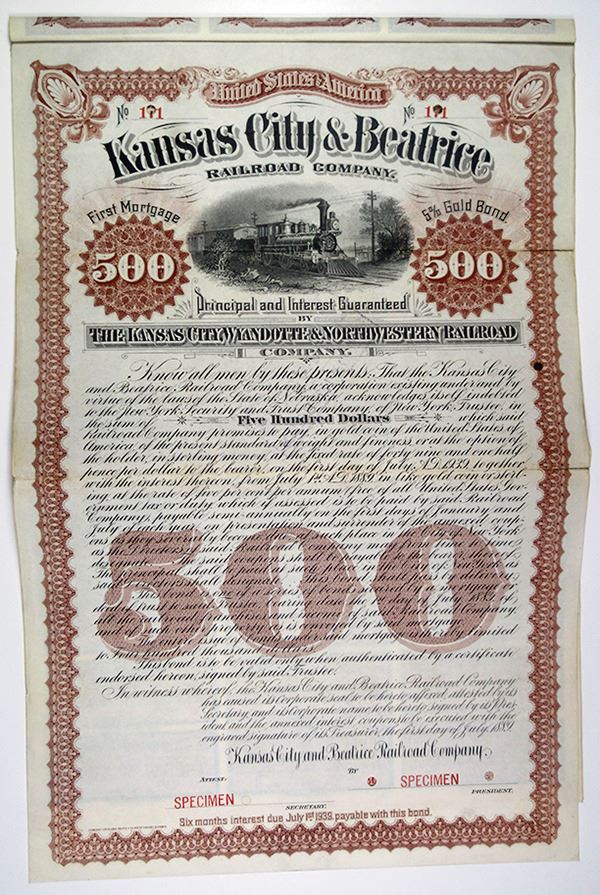 Nebraska, 1889 Specimen $500 First Mortgage 5% Gold Coupon Bond, Black print with brown border and underprint, Locomotive passing on tracks at top. Red specimen overprints, Serial numbers 171 that have been punched out on top left and right, POC's and Specimen overprints. "Principal and Interest Guaranteed by The Kansas City, Wyandotte & Northwestern Railroad Co." Fine condition with two Archivally reinforced 1 inch splits along horizontal folds, ABNC. Unlisted as a bond in Cox, listed only as a stock certificate. Unique specimen bond in the ABN Archives.