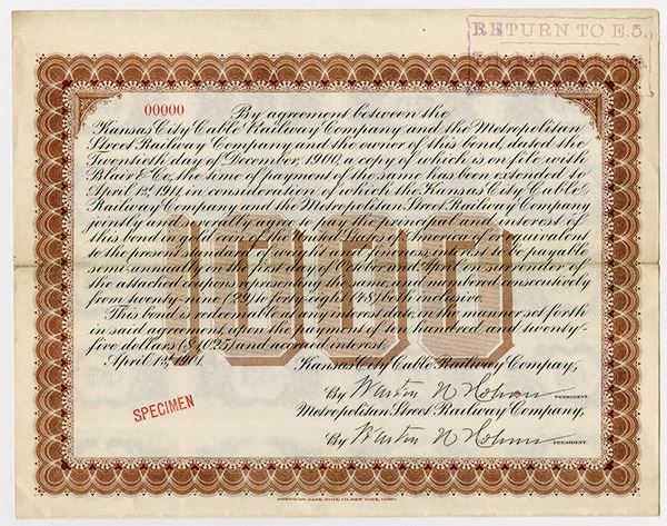 Missouri. $1,000 Specimen extension bond, Black print on brown border and under tint, No title or vignette on piece, "Return to" stamp at top, Specimen overprints and POC's, Fine-VF condition, ABNC.