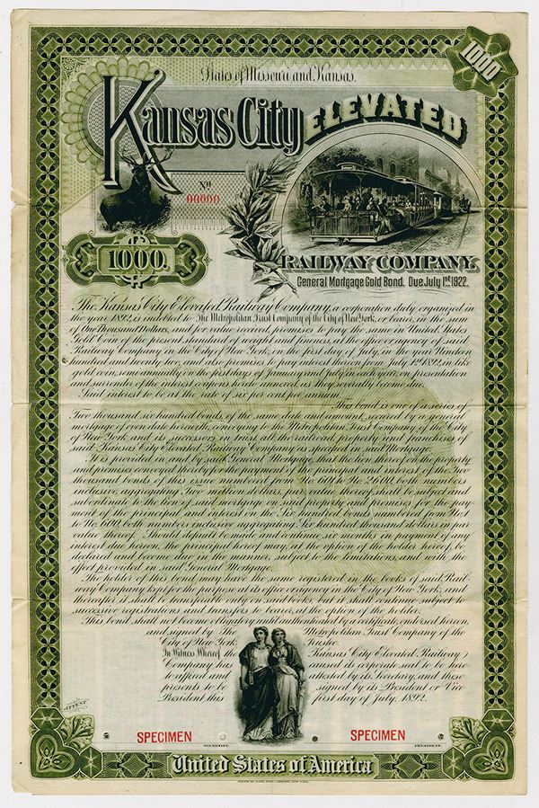 Missouri & Kansas. $1,000 Specimen 6% General Mortgage Gold Coupon Bond, Black print on green border and under tint, Company title at top with image of street car right below and allegorical women at bottom, Specimen overprints and POC's, VF-XF condition, ABNC. Known railroad, unlisted as a bond in Cox, only as a share certificate, Rare bond with only 2 found in the ABN Archives in 2002.