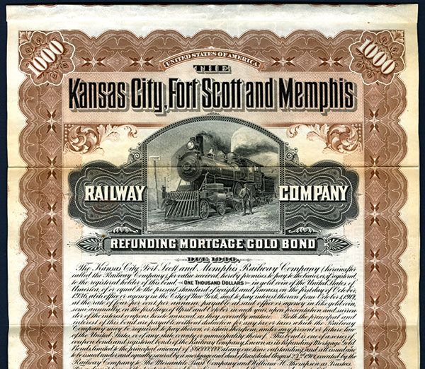 1901, $1000 Refunding Mortgage Gold Specimen Bond, Black printing with brown border and underprint, Man standing by locomotive top center, POC's and red SPECIMEN overprints, VF condition, ABNC. Listed railroad and listed bond variety in Cox.