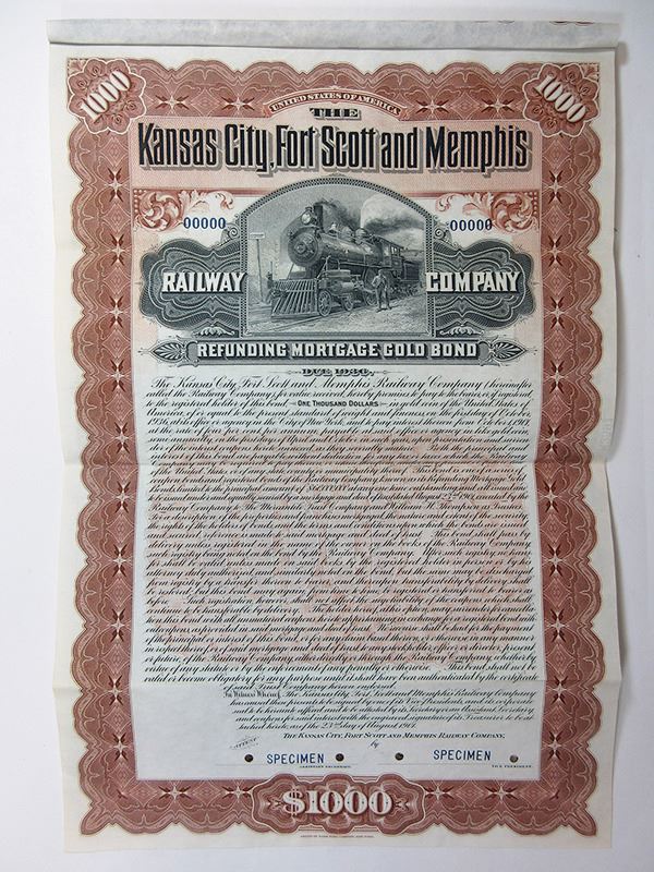 KS. 1901, $1000 Refunding Mortgage Gold Specimen Bond, Black printing with brown border and underprint, Man standing by locomotive top center, POC's and red SPECIMEN overprints, VF condition, ABNC. Listed railroad and listed bond variety in Cox.