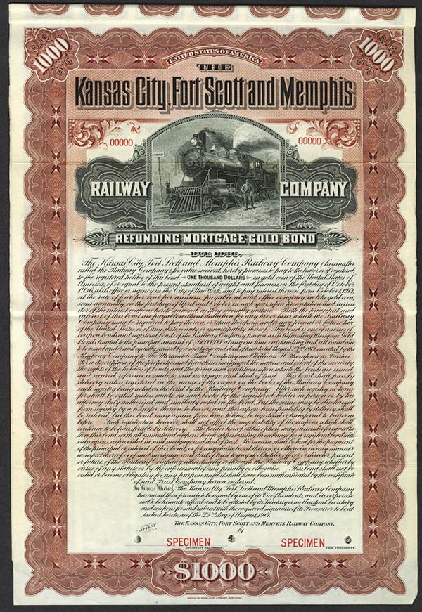 Kansas. $1000 Specimen Refunding Mortgage Gold Coupon Bond. Pink/brown border and undertint. Vignette of Locomotive 870 with gentlemen standing beside to it. Coupons attached. Red specimen overprint. POC's. XF condition. ABNC.